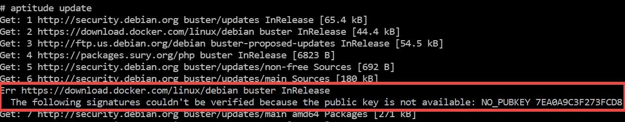 今天需要在老旧的debian8上安装docker,根据官方文档`https://docs.docker.com/engine/install/debian/ ` 的步骤,一步一步的开始安装,但全部操作完后,执行 apt-get update 时,始终会报NO_PUBKEY的错误,导致无法update源